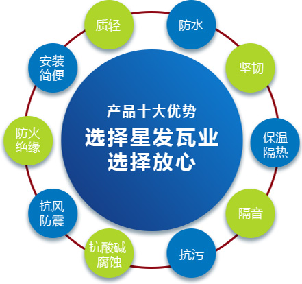 公司主要產(chǎn)品有《星發(fā)牌》合成樹(shù)脂瓦、APVC防腐耐候復(fù)合瓦、APVC發(fā)泡隔熱瓦、PVC半透明瓦、PVC防腐隔熱瓦、PVC防腐瓦、PVC防腐平板、PVC條紋板和ASA/PVC超耐候復(fù)合瓦等產(chǎn)品。產(chǎn)品一經(jīng)推出,已被廣泛應(yīng)用于國(guó)內(nèi)各類(lèi)平改坡項(xiàng)目和大型工業(yè)項(xiàng)目,遠(yuǎn)銷(xiāo)歐洲、亞洲、美洲和非洲等國(guó)外市場(chǎng),還獲選為廣州亞運(yùn)會(huì)、深圳大運(yùn)會(huì)、四川災(zāi)后重建等工程項(xiàng)目的應(yīng)用產(chǎn)品。公司在不斷創(chuàng)新和改革的基礎(chǔ)上,力求以更好的產(chǎn)品、優(yōu)良的服務(wù),用心、專(zhuān)心服務(wù)好每一個(gè)客戶(hù)。